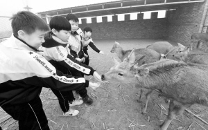 11月30日,在河北省文安县一处农庄,学生近距离喂食梅花鹿,了解其饮食特性。