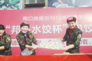 12月4日,周口晚报创刊13周年暖冬行大型公益活动——包饺子大赛启动第一场分站赛,69组138名选手激烈角逐后,6组选手获得分站赛一、二、三等奖。晚报记者 朱海龙 摄