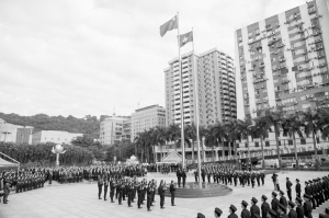 8时整,澳门警察银乐队奏响《义勇军进行曲》,在雄壮的国歌声中,国旗和区旗冉冉升起,在场人士肃立行注目礼。