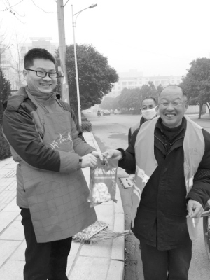 当天,从莲花大道到八一大道,再到太昊路、工农路、黄河路,一路上只要遇见环卫工人,周口晚报记者就送出两袋爱心水饺(如图)。看到环卫工人那一张张惊喜和满足的笑脸,听到他们不断地致谢,我们也期待着,这些暖心的举动能产生示范效应,今后能有更多的企业,加入到关爱为我们这座城市清扫的“马路卫士”行列里。