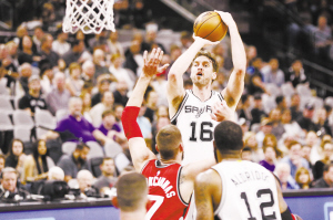 当地时间1月3日,马刺队球员加索尔(后)在比赛中投篮。当日,在2016/2017赛季NBA常规赛中,圣安东尼奥马刺队主场以110∶82战胜多伦多猛龙队。