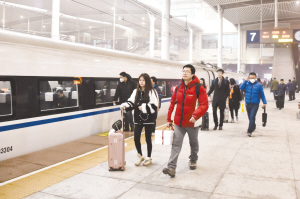 1月5日,在济南火车西站,乘坐G285次列车的旅客准备登车。