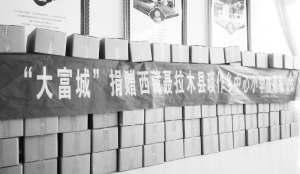 本报讯 1月10日上午,西华县“大富城”捐赠西藏聂拉木县琐作乡中心小学防寒服仪式在西华县城“大富城”售楼部举行。仪式上,“大富城”楼盘的开发商周口凯盛实业有限公司向西藏聂拉木县琐作乡中心小学捐赠400套防寒服。
