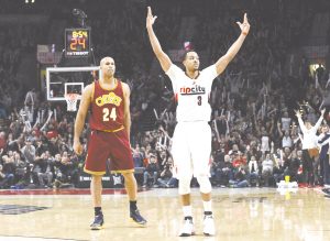 当地时间1月11日,开拓者队球员CJ迈克勒姆(右)在得分后庆祝。当日,在2016~2017赛季NBA常规赛中,波特兰开拓者队主场以102∶86战胜克利夫兰骑士队。