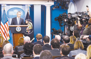 1月18日,美国总统奥巴马在华盛顿白宫出席记者会时讲话。美国总统奥巴马18日在白宫举行其任期内最后一场记者会。新华社发