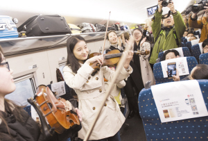 1月19日,华中师范大学音乐学院的大学生们在车厢内演奏。
