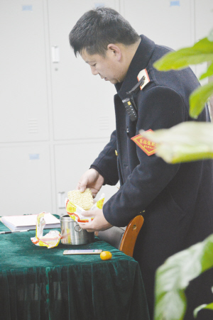 | 刚刚送走上一班列车,客运值班员胡波趁着下一班车还没有来,赶紧泡上方便面。早饭没有顾上吃,午饭得等到一点半以后了……