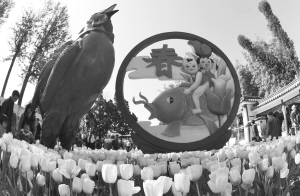2月5日,游人在昆明市大观公园里观赏盛开的郁金香和“鸡年迎春”造型。