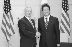 日本首相安倍晋三2月10日访问美国之前,美国防长马蒂斯上周末访日进行“摸底”,与安倍和日本防卫大臣稻田朋美分别会晤。日美官员声称将强化两国同盟关系。