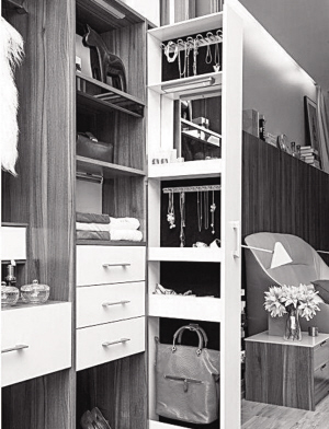 值得一提的是,每一张条凳都是可以分离的个体,也可以根据自己的喜好进行组合。为了使凳子的叠加更安全,设计师特地在凳面和凳脚设计了可以互相卡接的凹凸槽,这样博古架可以稳固地搭建起来。 定制家具的设计中也不乏温暖人心的设计,某品牌的海纳百穿系列就是一个典范。该系列产品不遵从传统衣柜的刻板设计,更多考虑人性化的使用功能。在产品和配件的开发上更具多元化。例如带来储物功能的柜门,可以收纳各种小配件;侧拉的长抽屉柜,同样可以收纳小配件,为衣柜提供多样化的储物功能。 海纳百穿系列