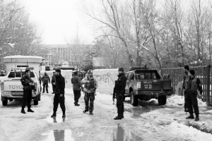2月7日,在阿富汗首都喀布尔,安全人员聚集在爆炸现场。