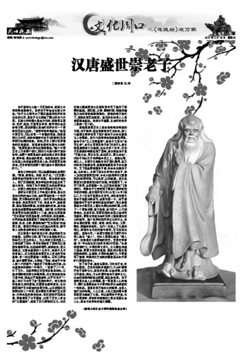 唐朝是我国历史上自始至终尊老奉道的王朝。老子姓李,高祖李渊尊老子为始祖。第二代皇帝太宗李世民下诏扩建老子出生地鹿邑太上老君庙。第三代高宗李治亲往鹿邑拜谒,封老子为“太上玄宗皇帝”,封老子之母为“先天太后”,命王公百官及举子皆习《老子》。唐玄宗是唐朝第九位皇帝,他在位四十五年,对老子及道教的尊崇达到了顶峰。唐玄宗说老子是“万教之祖,号曰玄元,东训尼父,西化金仙”,把老子列在孔子和释迦牟尼之上,道教在儒、佛之上。玄宗不仅每晚对老子顶礼膜拜,还三次给老子封爵加号,拨款增修鹿邑老子生地庙宇。又下诏全国增建老子庙,并命各地铸老子像。在科举上,玄宗下诏令玄学博士讲老子,举人加试《道德真经》等,令各州县推荐对《道德真经》有研究者,予以奖赏,以示鼓励。自己还两度对《道德真经》进行注疏,并诏颁天下,令天下臣民,必须家藏一本,以行政手段推广《道德经》,使得老子之学受到了最高礼遇和前所未有的尊崇。唐玄宗开元三年(公元715年)诏以二月十五老子诞辰为玄元节。后来唐武宗又敕老子诞辰为降圣节,全国休假一日。由于唐朝皇帝对于老子道学的重视和推行,使大唐帝国成为中国历史上最为光辉灿烂的时期,出现了一个国富兵强、路不拾遗、夜不闭户,人们和谐相处、友爱互助,百国来朝的贞观之治和开元盛世。国都长安成为当时世界上规模最为宏大的城市,整个世界的经济和文化的中心,世界各国的国君、使臣、客商、僧侣、学生、工匠、医生、胡姬纷至沓来。他们一旦进入了大唐的领土,看到车水马龙的繁华都市,无不由衷地赞叹。直到今天,一些西方国家仍习惯于把中国人称为“唐人”,把华人聚居处称为“唐人街”。这都是对大唐辉煌的肯定。英国史学家赫·乔·韦尔斯在其《世界史纲》中写道:“在唐初诸帝时代,中国的温文有礼、文化腾达和威力远被,同西方世界的腐败、混乱和分裂对照的那样鲜明。在唐朝,中国的极盛时代,中国呈现了繁荣、幸福和文艺活跃的景象远在任何同时代国家的前头。