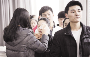 2月14日,中戏艺考复试进行中。中戏艺考要求考生全部素颜,但依然有许多考生偷偷化妆。为保公平,监考老师亲自帮考生现场卸妆(右图)。(中新)