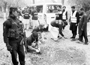 2月15日,在巴基斯坦白沙瓦,救援人员在自杀式爆炸袭击现场收集证据。