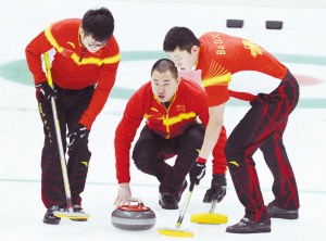 2月22日,中国队选手臧嘉亮(左)、巴德鑫(右)和刘锐在比赛中。当日,在日本札幌举行的第八届亚洲冬季运动会男子冰壶半决赛中,中国队以8∶1战胜中国台北队,晋级决赛。