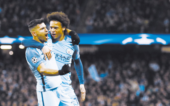 曼城队球员阿圭罗(左)进球后与队友萨内庆祝 欧冠联赛 曼城逆转摩纳哥 马竞击败勒沃库森 新华社伦敦2月21日电(记者 王子江)欧洲冠军联赛21日进行了两场16强首回合的比赛,阿圭罗独中两元,帮助曼城主场5∶3逆转摩纳哥;德甲劲旅勒沃库森则以2∶4不敌马德里竞技。 曼城第26分钟取得领先,斯特林接到萨内传中球,近距离推射入网。仅过6分钟,