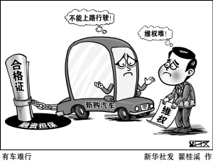 近一时期,辽宁省各级消费者协会陆续接到数以百计的消费者投诉,反映购买汽车后得不到汽车出厂合格证明,导致不能办理车牌和购买保险,不能上路行驶。原因是生产厂家、经销商、商业银行用合格证进行融资担保。辽宁省消协发布消费警示,此问题正在成为全国性的消费维权难点。 新华社发