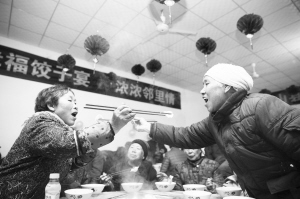 2月21日,在河北石家庄平山县卷掌村活动中心,村民们用长筷子互相喂食饺子。