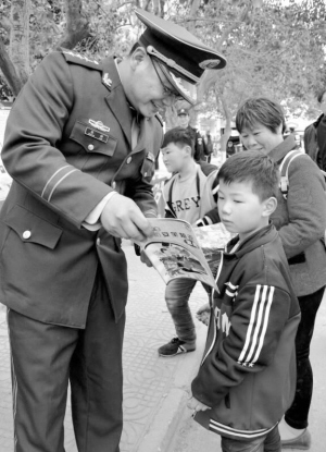 4月1日,消防官兵在给群众发放清明祭祀防火宣传页。