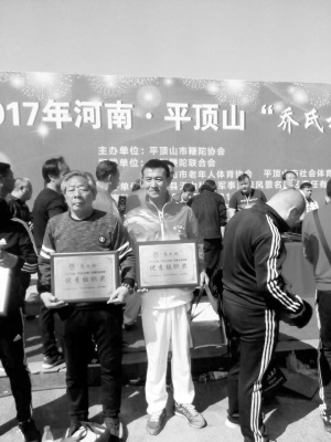 4月1日,应邀参加2017年河南平顶山“乔氏杯”鞭陀大赛的周口市鞭陀运动协会会长杜修林手捧优秀组织奖奖牌(右一)。据悉,这是今年继河南巩义第四届中原鞭陀文化交流赛之后,市鞭陀运动协会斩获的又一奖项。晚报记者 张志新 摄