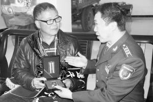 商水县胡吉镇南街的韩龙刚在武警工程大学服役,日前荣立个人二等功。近日,武警工程大学有关人员与该县人武部、民政局和胡吉镇的领导一起,来到韩龙刚老家,送来立功喜报和奖金。图为韩龙刚的父亲接过军功章。