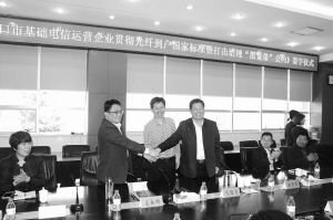 本报讯 为进一步贯彻光纤到户国家强标的实施,推动宽带业务健康发展,4月13日,河南省周口市联通、移动、电信三家运营商联合签署《周口市基础电信运营企业贯彻光纤到户国家标准暨打击治理“黑宽带”公约》(以下简称《公约》)。