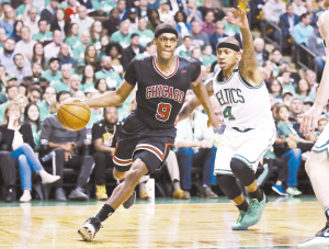 当地时间4月18日,公牛队球员隆多(左)在凯尔特人球员托马斯的防守下带球突破。当日,在2016~2017赛季NBA季后赛首轮第二场比赛中,芝加哥公牛队客场以111∶97战胜波士顿凯尔特人队,从而以2∶0的大比分领先。