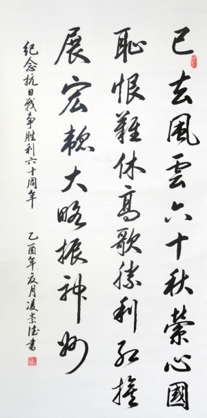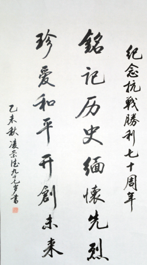 凌先生书法从晋唐入手,以行书见长,兼作榜书、隶书、楷书,其中楷书尤见功力,骨架硬朗,风韵优雅。先生早在1996年就是周口市书法家协会会员和河南省书法家协会会员。在老人的作品中,我们看到两幅中堂特别出众,内容分别是纪念抗日战争胜利60周年、70周年时所作。在较长的时间段内,为同一个内容持续创作,在书法家中,一定有着特定的因素。凌先生认真地说,书法要承载一种精神,他们这些老人都是经历过历史苦难的人,要让现在的孩子们不忘过去,珍惜现在,开创未来,做人和写字一样,要有一股精神,要站得住,不倒下,充满正气,为国争光。