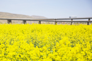 4月23日,在甘肃省定西市陇西县云田镇北站村,绽放的油菜花与远处的高速公路高架桥相映成景。