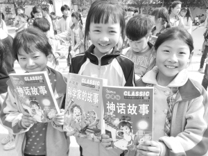 沈丘县新安集镇三大夫营小学的学生在展示她们收到的礼物。在“世界读书日”到来之际,为配合精准扶贫工作,周口职业技术学院的教师向该校小学生捐赠1200本儿童读物。