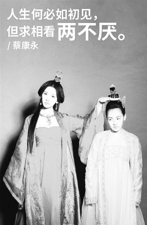 这组剧照中,混搭着“蔡氏”金句,“人生何必如初见, 但求相看两不厌”,借助蔡康永语言的风格魔力,不但坦白两人多年“相爱相杀”的关系,还将角色关系做了交代。