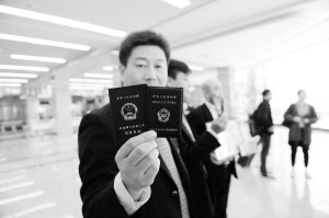 4月27日,司机在北京市政务服务中心向记者展示他领取的《网络预约出租汽车驾驶员证》和《网络预约出租汽车运输证》。