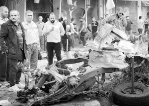 5月23日,在叙利亚霍姆斯,人们聚集在汽车炸弹袭击现场。