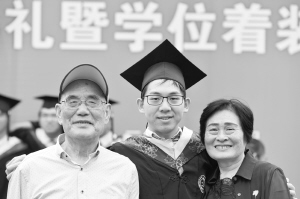 6月20日,今年80岁的原湖北红安中学老校长郭东明(左一)和老伴安美玲从老家赶来参加孙子郭改轩的毕业典礼。