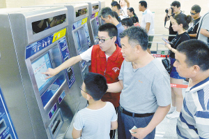 6月26日,在石家庄市地铁1号线博物馆站,志愿者为市民讲解自动购票的方法。