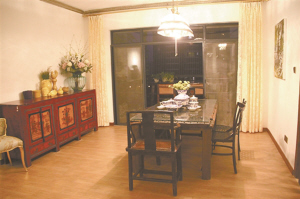 黄女士的新居原本三室两厅,设计师大胆地将与厨房相邻的小房间改成餐厅。餐厨空间采用黑白灰,那黑色镜面的冰箱,花灰色的地板,着实配得上如此大胆的户型改造。