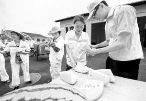 7月19日,志愿者把解暑药品和切好的西瓜送给凤山街道垃圾中转站的工人。