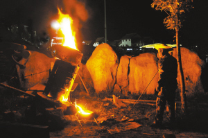 当晚应邀前来表演打铁花的民间艺人来自山西省,领队王全付已年逾六旬。让他开心的是,他的孙子也是表演中的一员。看来,老人还是希望这项民俗绝技后继有人,虽然苦点、累点,但美丽绽放的瞬间,他们与观众一样,收获了快乐!