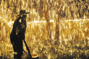 赤日几时过,清风无处寻。7月22日,进入“大暑”第一天,又值中伏开始,一年中最热的时期来了。天气预报显示,当天周口最高温度37℃,虽夜幕降临,但温度依然居高不下,酷热难耐。这样的天气,人们大多躲在空调屋里纳凉,谁还愿意玩火?而在淮阳一处水上乐园商演现场,却上演了一场民俗绝技——打铁花。当温度遭遇温度、激情碰撞激情,铁花漫天绽放,夜空被流火点燃。殊不知,美丽绽放的背后,是另一种美丽——打铁花艺人们用汗水摔开的炙热之花。