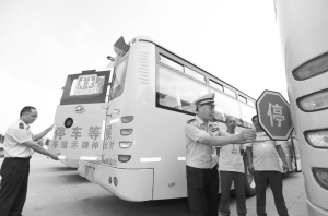 8月22日,山东泰安市宁阳县交警大队民警商积显(右三)和校车工作人员对停车牌进行安全检查。