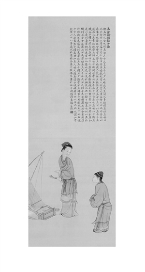 《孟母断机教子图》,绢本,设色,纵88.4厘米,横31厘米,画面署款:“乾隆二十八年(公元1763年)岁次昭阳协洽皋月既济生画于西子湖头读画楼并记。”此画现藏于北京故宫博物院。