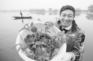 10月10日,江苏省海安县白甸镇蟹农钱春华展示捕捞的螃蟹。