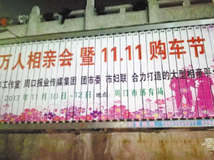据了解,周口万人相亲会是由市委组织部青年工作办公室、共青团周口市委、市妇联、周口报业传媒集团联合主办的大型相亲平台。为再一次给广大消费者搭建更好的选车、购车平台,周口报业传媒集团决定于11月10日至12日在市体育场隆重举办2017周口万人相亲会暨“双十一”购车节。