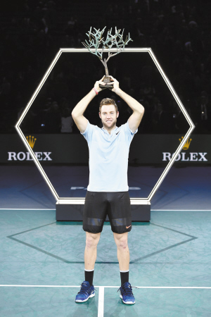 当地时间11月5日,美国选手索克在颁奖仪式上高举奖杯。当日,在法国巴黎举行的ATP巴黎大师赛男单决赛中,美国选手索克以2∶1战胜塞尔维亚选手克拉伊诺维奇,夺得冠军。新华社记者 陈益宸 摄