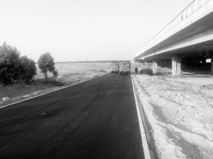 11月6日,在武盛大道与周项路交叉口附近,施工机器在铺设彩色沥青,此段工程完工标志着我市环沙颍河跑道全线开通。