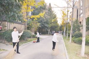 初冬时节,中原大地的阔叶木树叶开始凋敝,纷纷落下,行走到哪里,都可看到落叶。建业联盟新城尽管有大面积的常青树栽植,可是少量的阔叶木下仍落下不少的枯叶。十几名保洁员正在清扫树叶,小区的人行道、主干道、曲径……所有的路面都不放过。“我们一天不计次数清扫,现在还要再扫一次,因为业主快下班回来了,路面干净能让大家舒心。”一位保洁员说。
