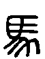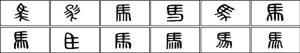 “马”字是一个典型的象形字。早期甲骨文“马”字写作 ,是一匹头、身、足、尾俱全的马的形象,马头朝上,背朝右,下部是四条腿,还有马鬃和马尾。四期甲骨文“马”字写作 ,书写比较简便,但形象犹存。金文写作 、篆书写作 、隶书写作 ,皆与甲骨文相似,而简化的“马”字一点也不像马的形象了。