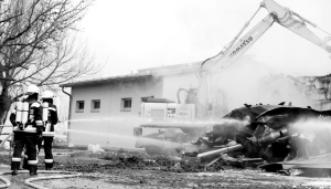 12月12日,在奥地利发生爆炸事故的鲍姆加滕天然气输气站,两名消防队员在火场灭火。